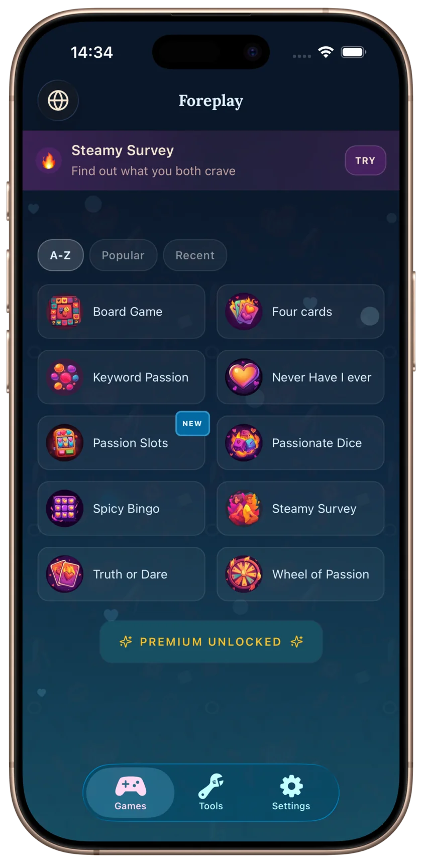 1,500+ steamy ideas, 10 games, and 8 tools for couples. This iOS app helps you discover new desires, explore boundaries, and keep every date night feeling fresh.